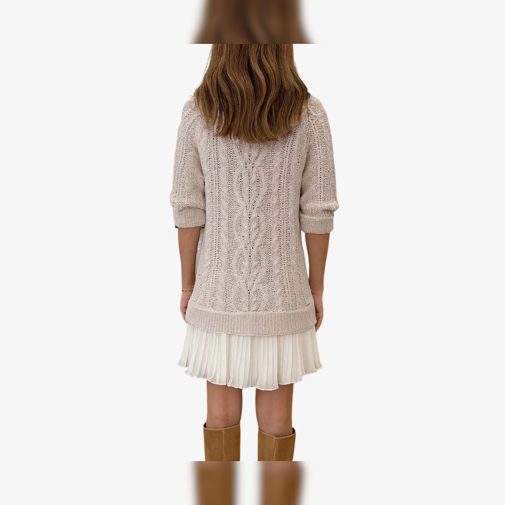 Oppdag den perfekte blandingen av komfort og stil med denne strikkede kjolen med plissert skjørt fra Clarea Fashion. Kjolen kombinerer en varm kabelstrikket overdel med en luftig, plissert underdel for et elegant og feminint utseende. Ideell for høsten og vinteren – stilig nok til en middag, men komfortabel nok til hverdagsbruk.
